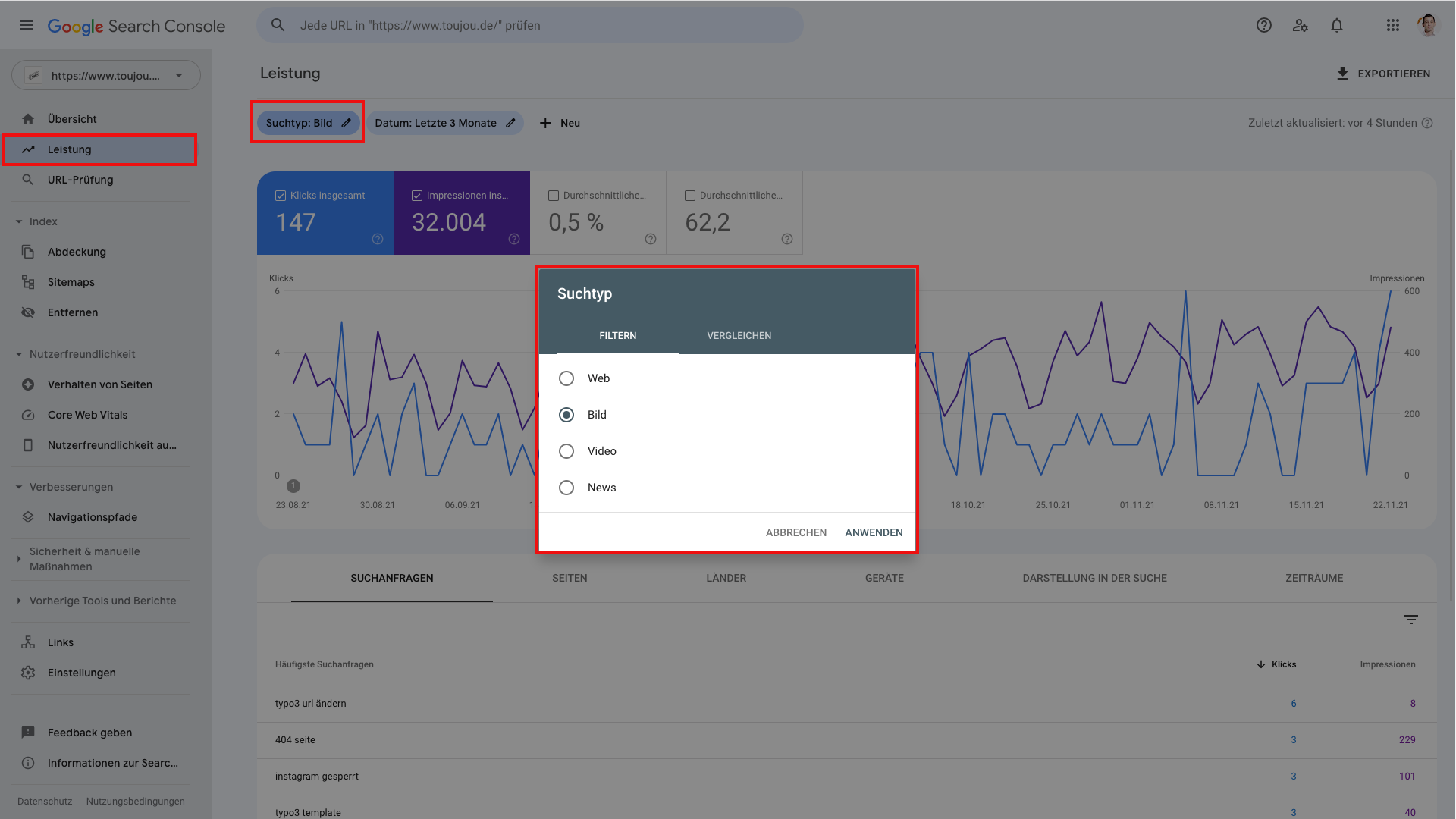 Ihren Erfolg im Optimieren von Bildern messen Sie am einfachsten über die Google Search Console. Klicken Sie in der linken Spalte auf das Modul Leistung und wählen Sie anstelle des Suchtyps Web die Option Bild aus. Schon sehen Sie, für welche Keywords Sie mit Bildern ranken.