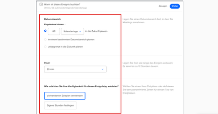 Bestimmen Sie die Dauer des einzelnen Termins, hier 30 Minuten. Die Option Custom im Dropdown-Menü ermöglicht Ihnen neben den vorgegebenen Zeitfenstern einen individuellen Zeitrahmen vorzugeben.