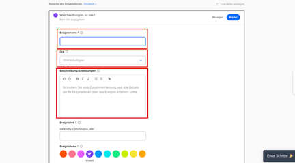 Tragen Sie den Ereignisnamen ein. Voreingestellt ist auch eine Ereignisfarbe, die Sie innerhalb der Auswahl wechseln können. Optional können Sie noch einen Ort und eine Beschreibung angeben. Beim Ort wählen Sie zwischen verschiedenen Video-Plattformen oder einem persönlichen Meeting vor Ort.