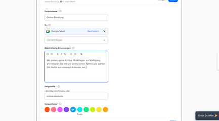 Tipp: In der Beschreibung können Sie auf die Nutzung Ihres Google-Kalenders oder von Google Meet als Video-Plattform eingehen. So teilen Sie Usern direkter DSGVO-relevante Informationen mit.