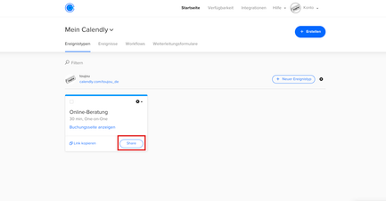 Klicken Sie im Dashboard auf den Share-Button Ihres angelegten Termins. Gegebenenfalls hat Calendly bei der Registrierung automatisch einen Termin erstellt, der an dieser Stelle auch angezeigt würde. Diesen entfernen Sie mittels Klick auf das Zahnrad-Symbol und der Auswahl des Löschvorgangs.