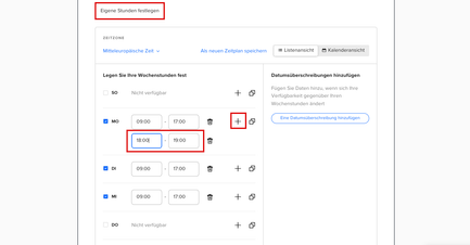 Für eine individuelle Anpassung der Zeiten klicken Sie auf den Button Eigene Stunden festlegen und tragen anschließend die Zeiten ein. Über das +-Symbol definieren Sie für den jeweiligen Tag ein zweites Zeitfenster.