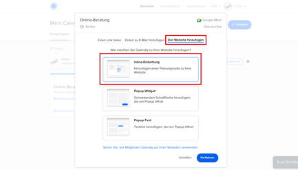 Wählen Sie die Option Der Website hinzufügen aus. Um die Online-Terminbuchung auf Ihrer Website einzubinden, wählen Sie die Inline-Einbettung mit der Maus an. Dadurch erfolgt mittels HTML-Einbettung eine prominente Einbettung auf der gewünschten Seite.