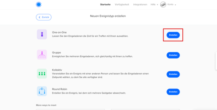 Wählen Sie die Option One-in-One für eine Online-Terminbuchung zwischen Ihnen und einem User. Obwohl es One-in-One heißt, erlaubt Calendly auch mehrere Gäste zum Termin einzuladen. Sollte diese Option in Ihrem Tarif nicht enthalten sein, können beide Teilnehmer:innen selbstredend den Video-Link mit Drittpersonen teilen. So können beliebig viele Personen teilnehmen.