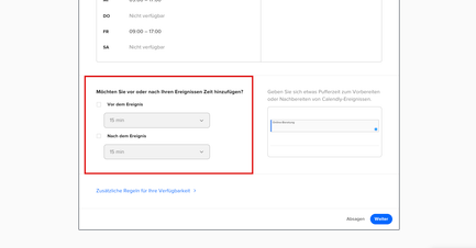 Um nicht von einem Termin zum nächsten hetzen zu müssen bzw. etwas Puffer zum vorherigen Termin einzurechnen, blocken Sie Zeit vor oder nach einer Online-Buchung. Setzen Sie dafür das Häkchen neben der gewünschten Option und definieren Sie im Dropdown-Menü das geblockte Zeitfenster.