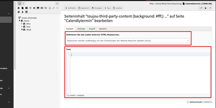 Gehen Sie anschließend in das Backend Ihrer Website. In diesem Fall ist es toujou, das auf TYPO3 basiert. Erstellen Sie ein HTML-Element und geben dort den kopierten Code ein. Beachten Sie, welche Option Sie für das Laden externer HTML-Ressourcen definiert haben.