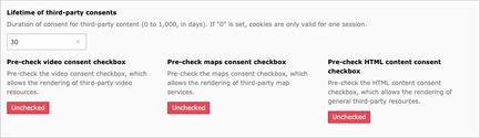Die möglichen Konfigurationen für externe Inhalte beschränken sich in toujou auf ein Minimum. Sie sollten nur verändert werden, wenn Sie explizite Werte für die Speicherdauern des Consents wünschen oder Sie – über vertragliche Grundlagen mit Ihren Nutzern – kein aktives Einverständnis benötigen.
