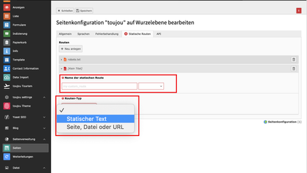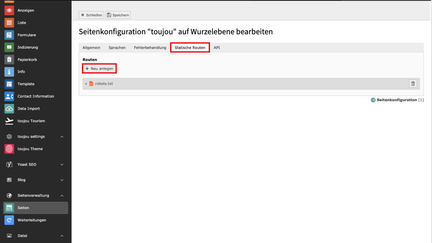 - Gehen Sie auf den Reiter Statische Routen und erstellen Sie einen neuen Eintrag, indem Sie auf + Neu anlegen klicken.