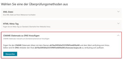 - Für den DNS-Eintrag bei Ihrem Domainhoster legen Sie keine TXT-Datei wie für Facebook oder Google an, sondern einen CNAME-Datensatz. Dies ist allerdings der einzige Unterschied. Halten Sie sich ansonsten an die Anweisungen in der Anleitung zum Erstellen eines DNS-Eintrags wie oben beschrieben.