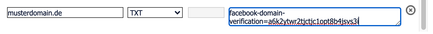 - Geben Sie den generierten Code (von Google, Facebook o.ä.) im entsprechenden Zielfeld ein, beispielsweise facebook-domain-verification=a6k2ytwr2tjctjc1opt8b4jsvs3i. Für Bing geben Sie den Namen des CNAME-Datensatzes ein.