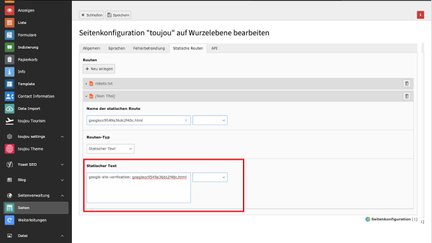 Hinweis: Wenn Sie mehrere Web-Adressen in Ihrem TYPO3-Backend besitzen, beispielsweise toujou.de und toujou.com, muss jede Domain einzeln verifiziert werden.