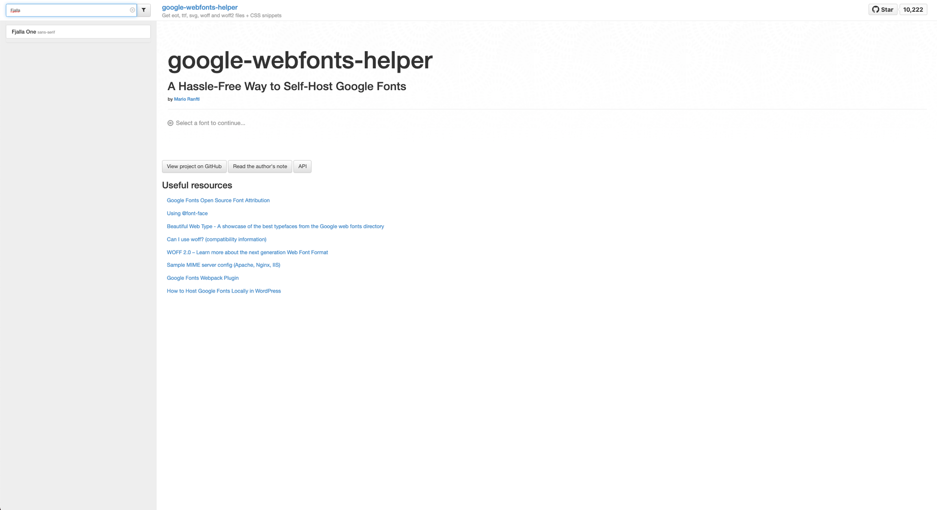 Geben Sie die gewünschte Schriftart im Google Webfont Helper im linken oberen Suchfeld ein und klicken Sie auf das Ergebnis. In unserem Fall ist das Fjalla One. Auf der rechten Seite öffnen sich neue Informationen.