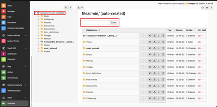 Das Bild ist nicht in dem Ordner, den man vermutet und nun geht die Suche los. Wer kennt die Situation nicht? Doch über einen Klick auf den übergeordneten Fileadmin können Sie im Suchfeld den Mediennamen eingeben. Das System durchläuft anschließend alle Ordner und spuckt die Datei mit dem Suchbegriff aus.