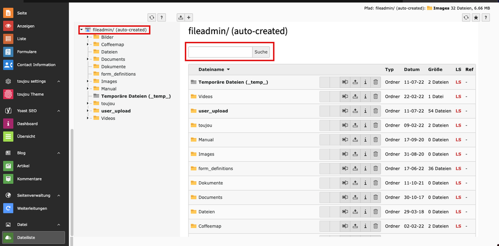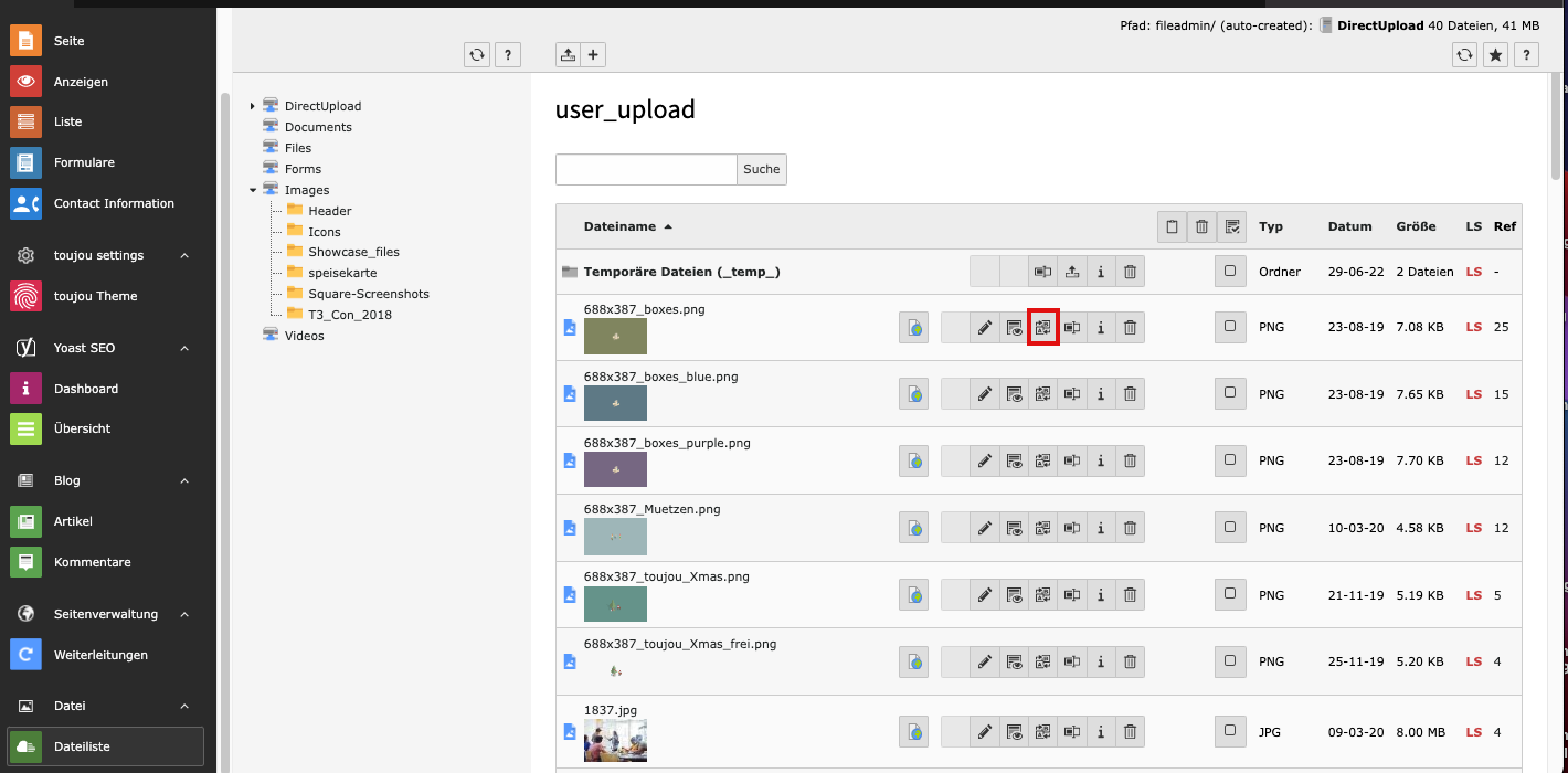 Der Fileadmin (Dateiliste) erlaubt nicht nur das Hinterlegen von Medieninhalten im toujou-Backend und den Zugriff auf die Dateien, wie in unserem Tutorial beschrieben. Das TYPO3-Feature bietet noch viel mehr.