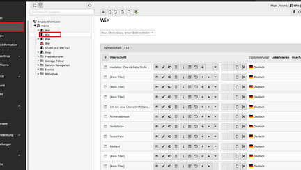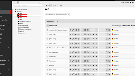 Mit »Einfügen nach« wird die Seite direkt an diesem Ort eingereiht, mit »Einfügen in« wird die Seite eine Hierarchieebene darunter platziert. Anschließend können Sie direkt mit dem Befüllen des Contents (Text, Bilder, Videos) starten.