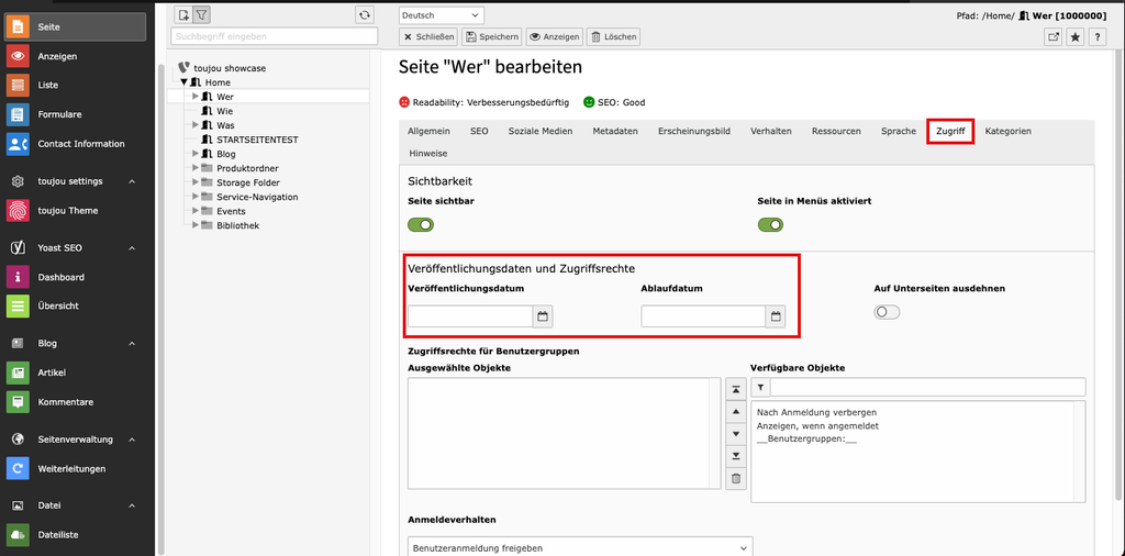 Nutzen Sie automatisierte Veröffentlichungs- und Ablaufdaten für Seiten oder Elemente. So müssen Sie nicht vor dem PC sitzen, wenn eine geplante Seite online oder offline gehen soll. Einstellbar ist diese Funktion in den Seiteneigenschaften unter dem Reiter Zugriff in den Veröffentlichungsdaten bzw. Element-Einstellungen (Settings).