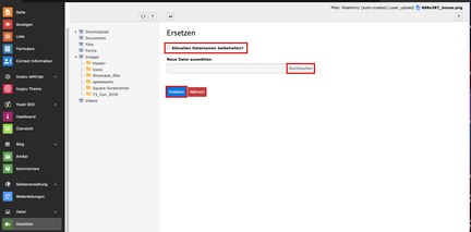 - Laden Sie das neue Bild aus Ihrer Ablage hoch. Entscheiden Sie, ob der Dateiname beibehalten werden soll oder nicht. Drücken Sie auf »Ersetzen«, wird das Bild im gleichen Ordner / an der gleichen Stelle in der Dateiliste geführt.