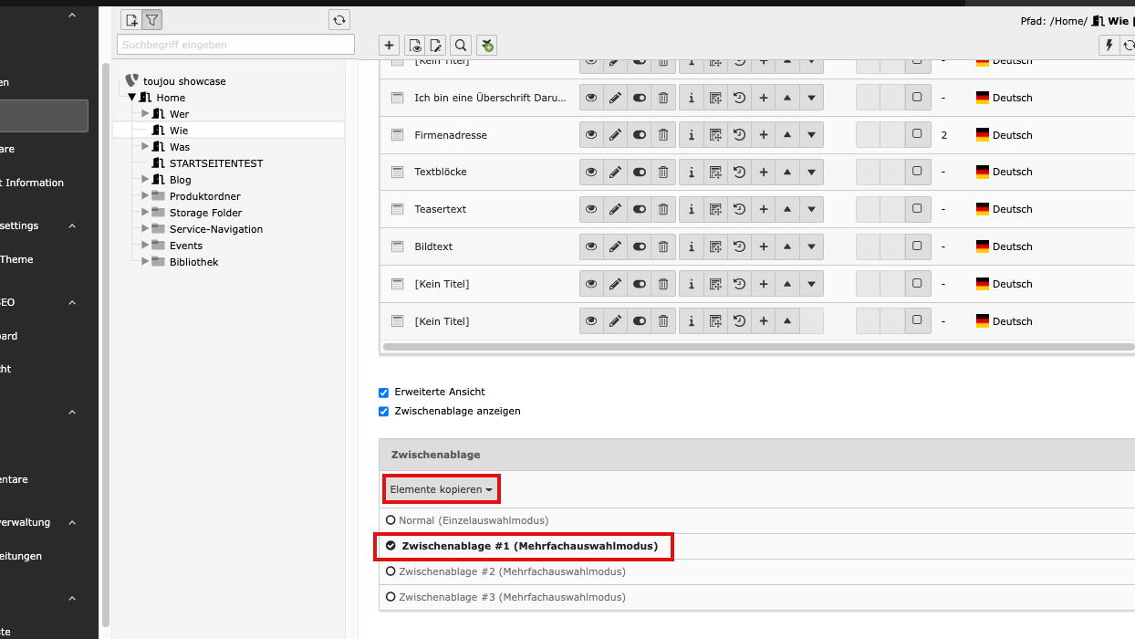 Klicken Sie im Backend auf die Listenansicht einer Seite. Gehen Sie hierfür in der Modulleiste auf Liste und wählen Sie die gewünschte Seite, auf der die zu kopierenden Elemente liegen (in unserem Beispiel »Wie«).