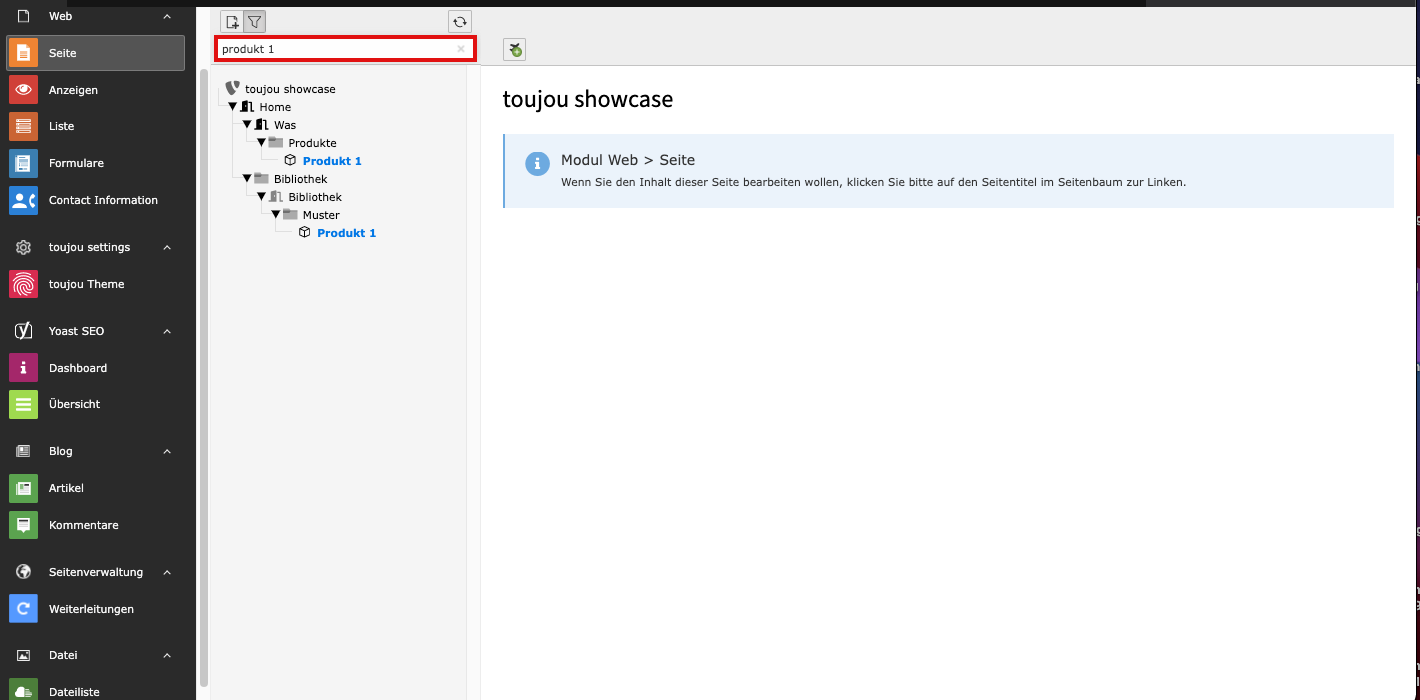 Für viele bereits ein erlerntes Verhalten beim Surfen auf anderen Websites: Die Suchfunktion aka Strg + F oder für Mac-User cmd + F. Auch im toujou-Backend lassen sich einzelne Seiten per Suchfilter finden – und so manuelles Durchsuchen im Seitenbaum umgehen.