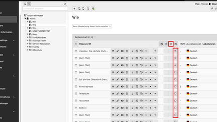 Möchten Sie mehrere Seiten auf einmal erstellen, klicken Sie auf eine Seite im Seitenbaum. Es öffnet sich das Seiten-Menü. Navigieren Sie auf »Weitere Optionen« und wählen Sie anschließend »Mehrere Seiten erzeugen« aus. Es öffnet sich eine neue Eingabemaske, in die Sie Seitentitel eingeben und den Seitentyp bestimmen. Klicken Sie final auf »Seiten anlegen«, um den Vorgang abzuschließen. Die Seiten werden anschließend eine Hierarchie-Ebene unter der zu Beginn ausgewählten Seite angezeigt.
