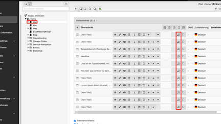 Nutzen Sie das Bearbeiten-Icon oben rechts in einem Seitenbereich. Anschließend öffnen sich alle dort gelisteten Elemente. Besonders wertvoll ist dieses Feature für kopierte Seiten und da insbesondere im Inhaltsbereich (content area), in dem in der Regel die meisten Elemente hinterlegt sind.