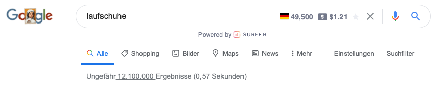 Eine Alternative zu Ubersuggest ist der Keyword Surfer, der ebenfalls eine Extension für Chrome und Firefox ist. Auch hier können Sie für jede Suchanfrage die relevanten Daten wie Suchvolumen und CPC erfassen – allerdings ohne Einschränkungen und Limits. Zudem zeigt das Tool unter jeder URL den geschätzten, monatlichen Traffic der Website, Anzahl der Wörter sowie Anzahl des genauen Keywords auf der jeweiligen Seite an.