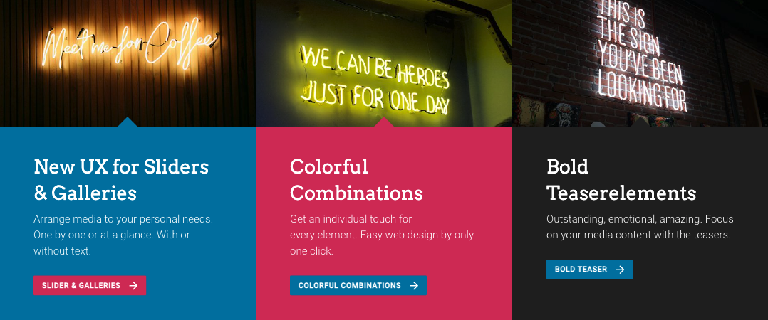 Um Medienelemente in den Vordergrund zu stellen, bieten sich die zahlreichen Teaser an. So ist beispielsweise der Cinema-Teaser nicht nur im Medium-Text-Verhältnis von 50:50, sondern auch im Verhältnis von 66:33 und 33:66 verfügbar. Dabei ist sowohl das Medium links- oder rechtsbündig möglich.