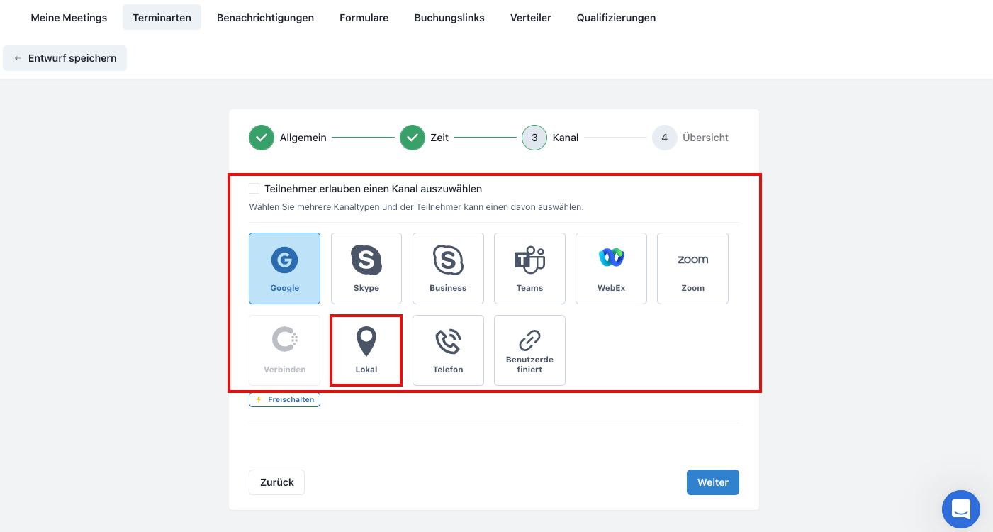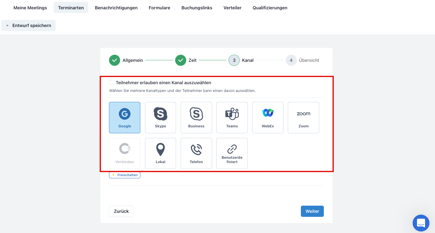 Für die Online-Variante stehen Ihnen bei der Kanal-Auswahl die gängigen Anbieter wie Google, Skype und Microsoft Teams sowie Zoom zur Verfügung. Auch das Telefon kann gewählt werden, sofern eine Nummer hinterlegt ist. In unserem Beispiel ist Google das Mittel zur Wahl.
