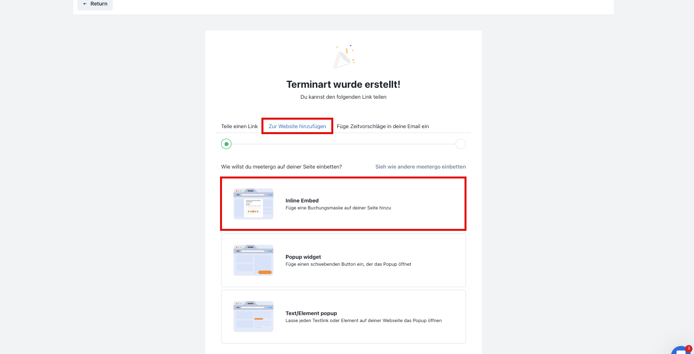 Um die Online-Terminvergabe von Meetergo auf Ihrer Website einzubinden, klicken Sie auf »Zur Website hinzufügen«. Wählen Sie anschließend die Option Inline Embed.