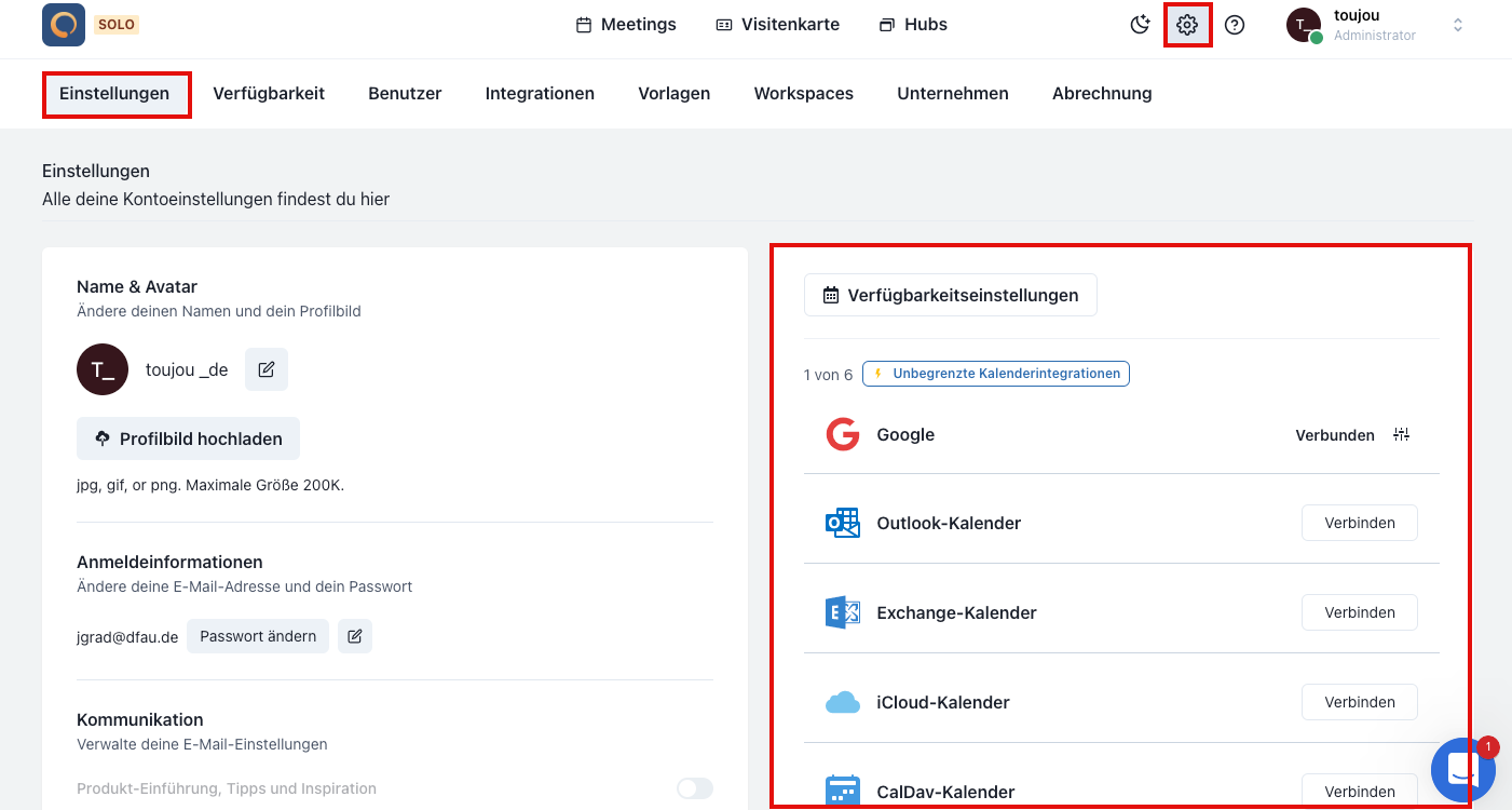 Sie können den Kalender auch zu einem späteren Zeitpunkt verknüpfen. Wählen Sie dafür das Zahnrad-Symbol in der oberen Leiste, um auf die Einstellungen zu gelangen. Auf der rechten Seite finden Sie die entsprechende Auswahl und können sich direkt über Verbinden mit dem eigenen Kalender verknüpfen. So werden Doppelbuchungen vermieden.