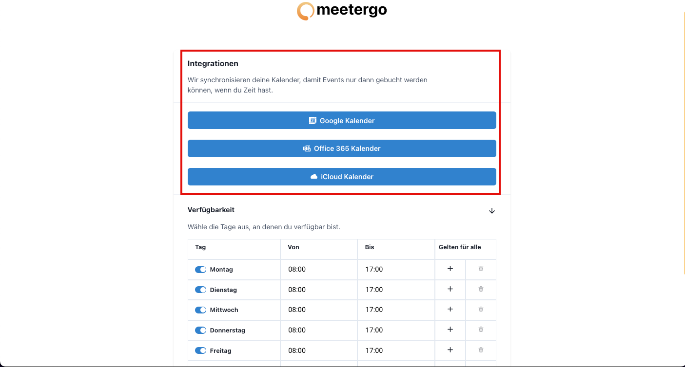 Um die Online-Terminbuchung auf der Website korrekt anzuzeigen, muss Ihr Meetergo-Account mit einem Kalender verbunden werden. Direkt nach der Registrierung erhalten Sie die Möglichkeit, Ihren persönlichen Kalender mit dem Tool zu verbinden. Ihnen stehen Google, iCloud und Outlook zur Verfügung.