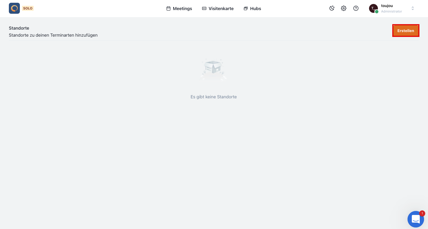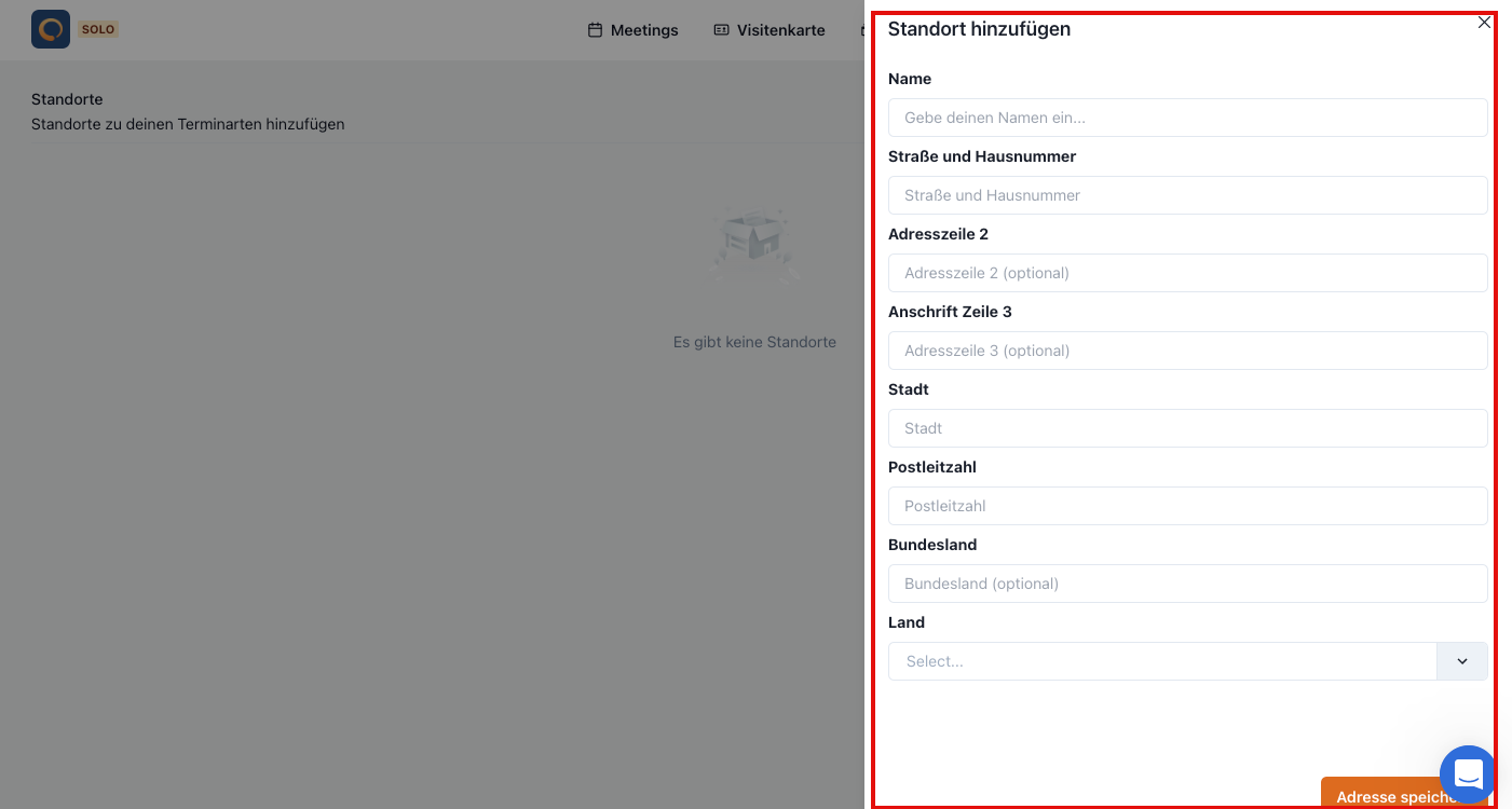 Für einen Vor-Ort-Termin wählen Sie die Option des lokalen Standortes. Beachten Sie, dass hierfür eine Adresse hinterlegt werden muss, bevor sie im Dropdown-Menü anwählbar ist. Erstellen Sie einen neuen Standort, indem Sie die Option anklicken und anschließend »Neuer Ort« klicken. Es öffnet sich eine neue Seite. Klicken Sie auf den »Erstellen«-Button. Wiederum öffnet sich ein Pop-up-Fenster, in dem Sie die Textfelder Name, Straße und Hausnummer, Stadt und Postleitzahl zwingend ausfüllen. Klicken Sie abschließend auf »Adresse speichern«.