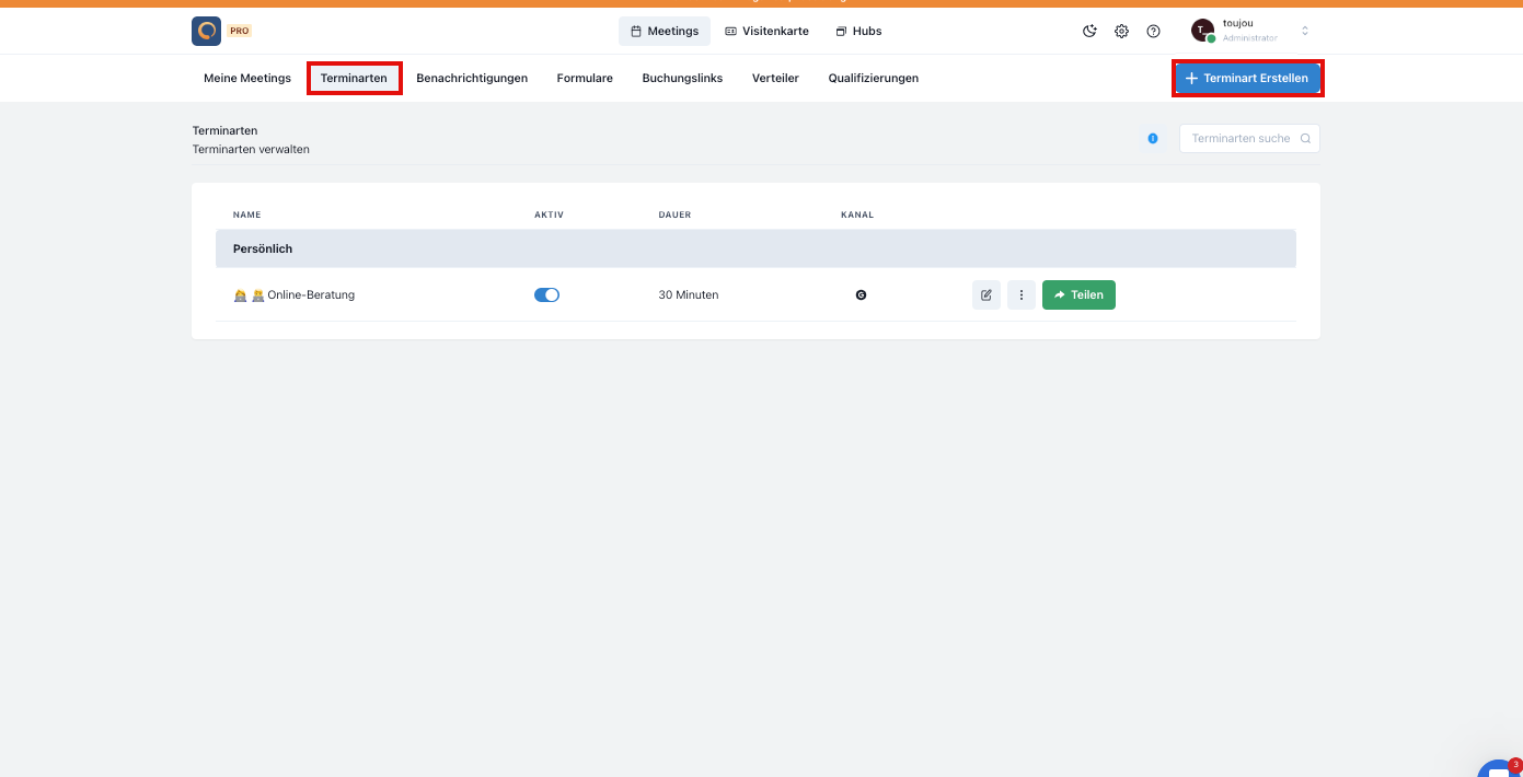 Bei Meetergo erstellen Sie einen Online-Termin, indem Sie unter dem Reiter Terminarten auf den blauen Button »+ Terminart erstellen« klicken.