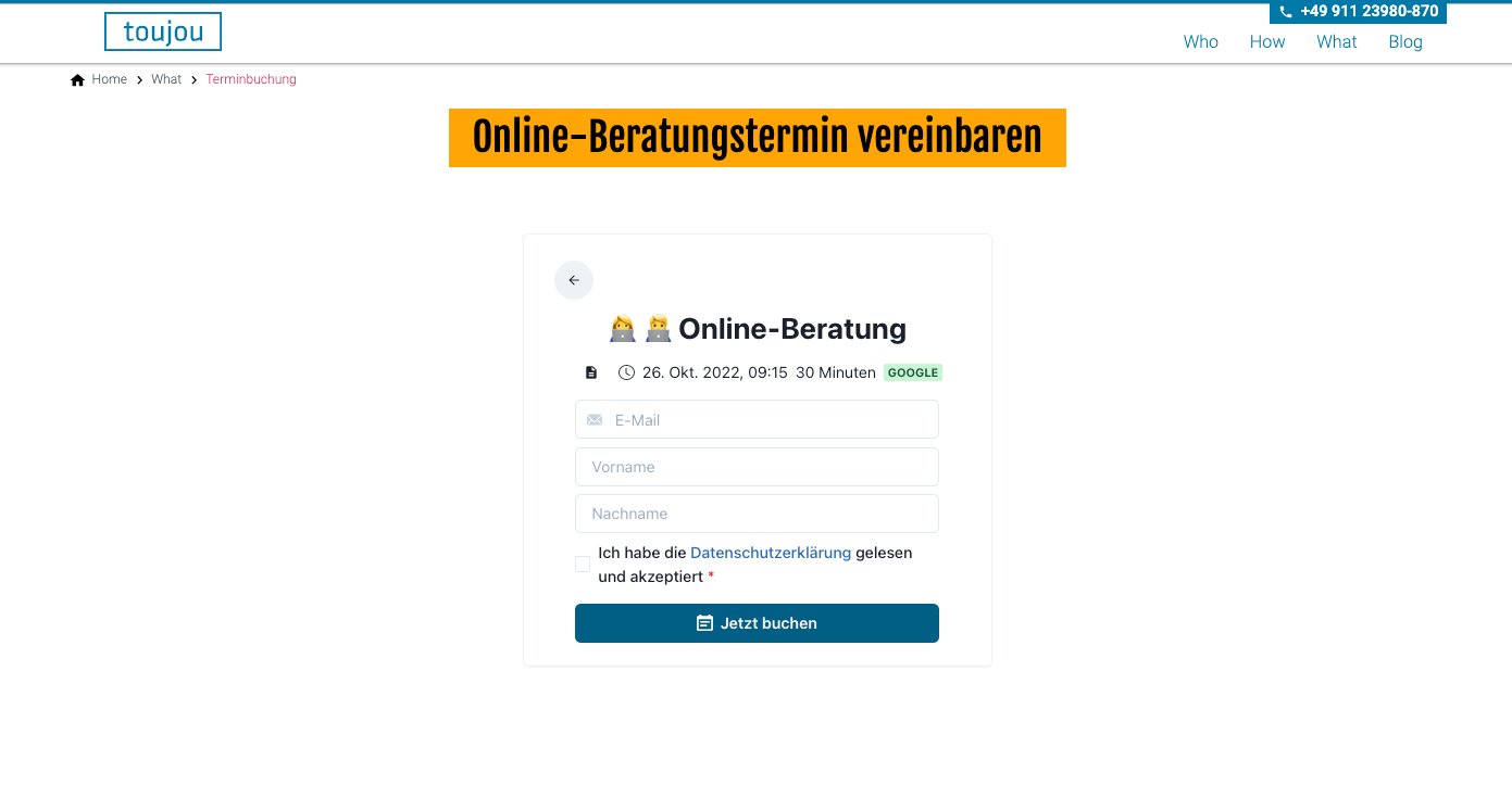 Schon erscheint der Online-Buchungskalender von Meetergo auf Ihrer Website und Terminvereinbarungen sind möglich. Sie müssen keine E-Mail-Korrespondenz führen. User klicken sich einfach durch die zwei Schritte, füllen die Felder aus. Fertig. Sie sind dank Opt-in bei der Einwilligung der Cookies aus DSGVO-Sicht auf der sicheren Seite.
