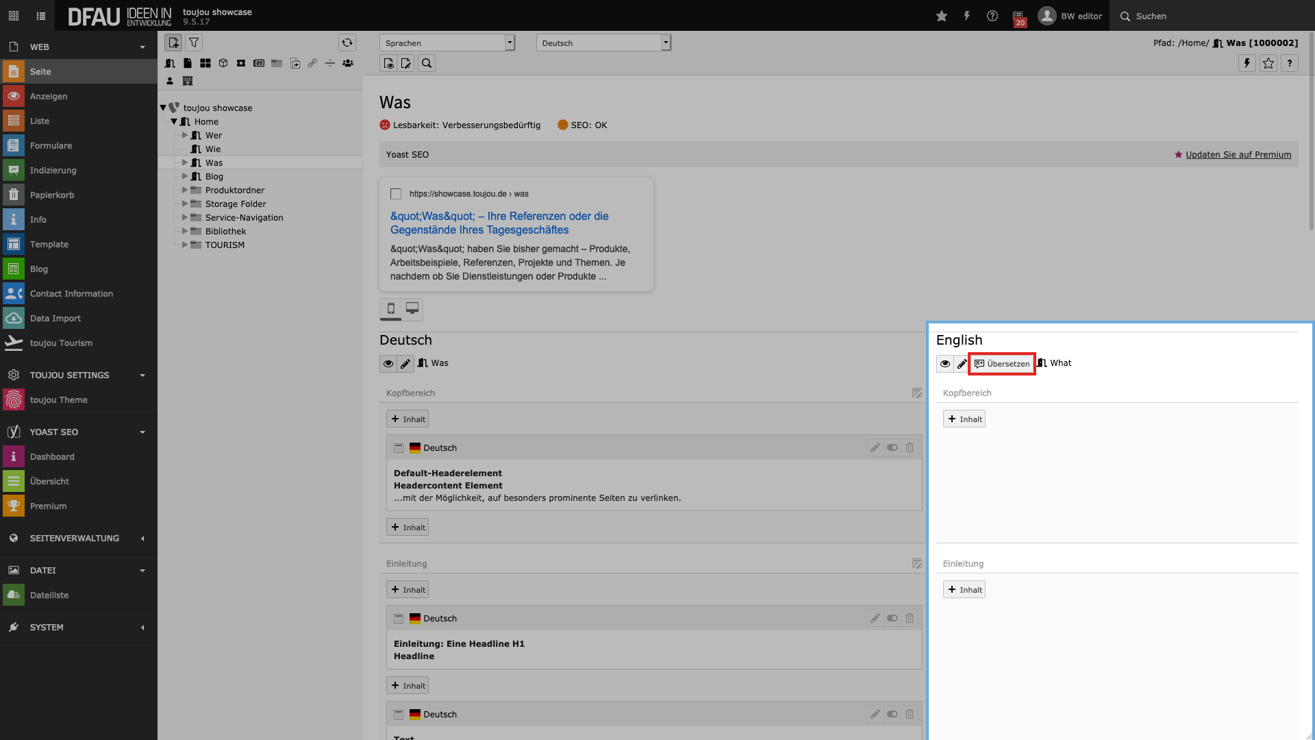 Bei der Content-Erstellung sollten Sie die Texte immer selbst verfassen. Nehmen Sie bei Bedarf die Dienste eines professionellen Übersetzers in Anspruch, sofern Sie nicht Muttersprachler sind. Die Texte, Bilder etc. übersetzen Sie in toujou in die gewünschte Sprache mit nur wenigen Mausklicks innerhalb eines übersichtlich angeordneten Backends.