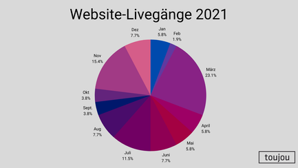 Beginnen wir mit den Livegängen der toujou-Websites in 2021 pro Monat. März mit 23,1% und November mit 15,4% waren die beiden beliebtesten Monate des Jahres. Zusammen mit dem Juli, auf den 11,5% aller Livegänge entfielen, machen diese TOP-3-Monate genau 50% aller Livegänge in 2021 aus. Als ob wir uns diese Zahlen so zurechtgelegt hätten ;)
