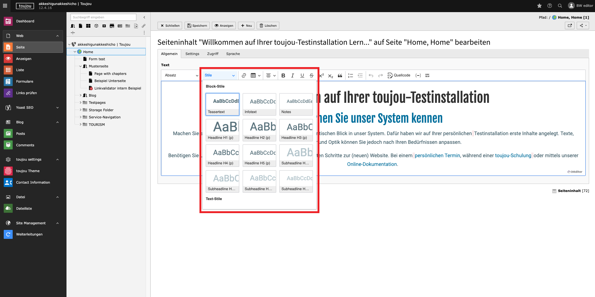 Beim Richt Text Editor wurde der Sprung zum aktuellen CKEditor 5 vollzogen. Dabei profitiert TYPO3 von der Weiterentwicklung und dem Support dieser Version. Für toujou-Kundinnen und -Kunden ändert sich an der Funktionalität nicht viel. Einzig die Auswahl der Stile kommt im optischen Refresh daher und bietet nun eine übersichtliche Darstellung der verschiedenen Optionen. Zudem sind nun alle Auswahlmöglichkeiten unter Blockstile vereint, die Unterteilung mit Objektstile entfällt also. Bei der Tabellen-Auswahl sind gleichzeitig mehr Spalten direkt auswählbar.