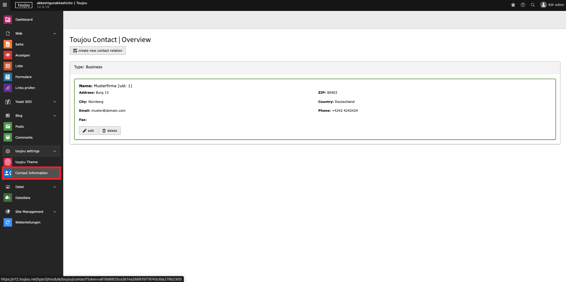 Das Modul Contact information befindet sich nun im Bereich toujou settings, unterhalb des Moduls toujou Theme. An der Funktionalität des Kontakt-Moduls hat sich nichts geändert. Hier geht es zu allen wichtigen Informationen via Tutorial.