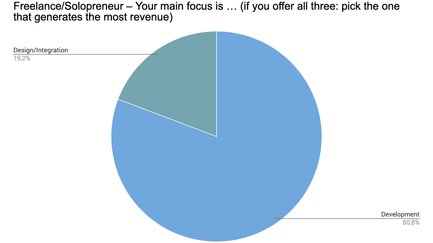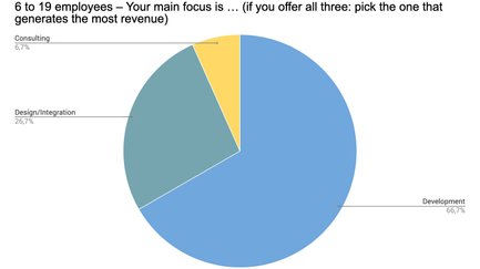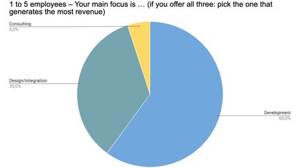 Die Entwicklung nimmt in jeder Gruppe die mit Abstand wichtigste Position ein. Interessanterweise nimmt der Anteil der überwiegenden Beratungsleistungen mit wachsender Unternehmensgröße zu – wobei Freelancer gar nicht auf Consulting setzen.