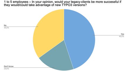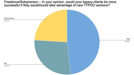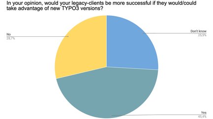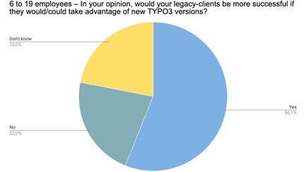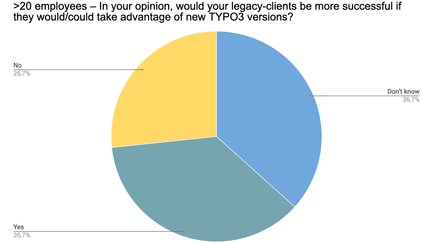 Dies ist ein sehr interessantes Ergebnis: 28,7 % sind nicht der Ansicht, dass ein TYPO3-Versionsupdate erfolgversprechend für Alt-Kunden sein könnte. Unsere Schlussfolgerung: Hierbei muss es sich um Kunden handeln, deren Geschäftsmodell nicht auf einen profitablen Unternehmensauftritt im Web aufbaut. Andernfalls ist dies ein bedenklich hoher Wert. Wir würden uns sehr über detailliertes Feedback freuen, sollten auch andere Leser dieser Meinung sein oder Sie als Teilnehmer an der Umfrage diese Option gewählt haben.
