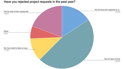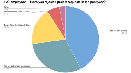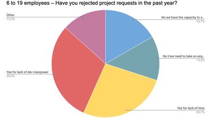 | Ja, aus Mangel an Entwicklern (%) | Ja, aus Zeitmangel (%) | Nein, Auslagern von Kapazitäten möglich (%) | Nein, jedes Projekt wird angenommen (%) | |