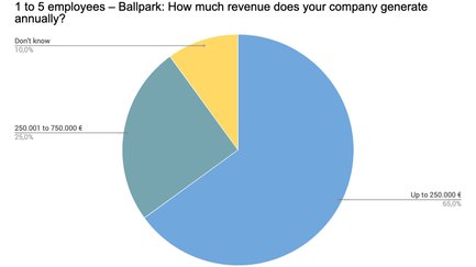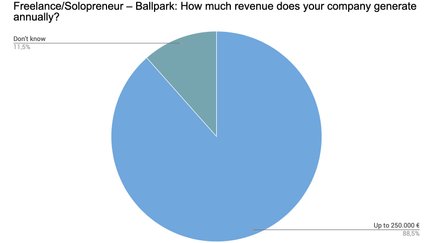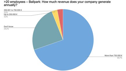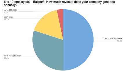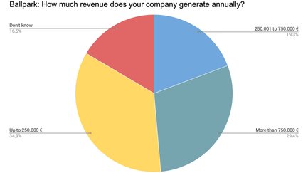 Von allen Teilnehmern, die ihre Umsatzschätzung abgegeben haben, stellt der mittlere Sektor von 250.000 bis 750.000 € den kleinsten Anteil. Kleinere Umsätze von bis zu 250.000 € sind am stärksten vertreten (34,9 %), gefolgt von Umsätzen über 750.000 € (29,4 %).