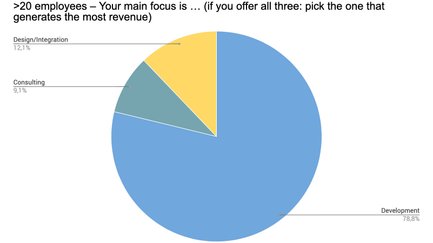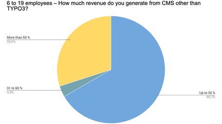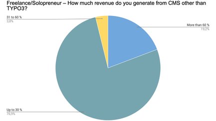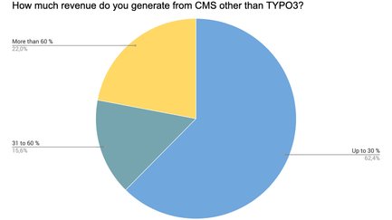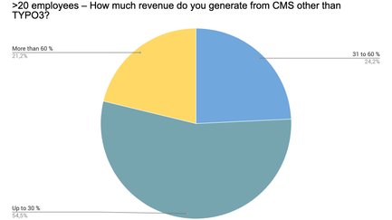 Nichtsdestotrotz generieren immerhin 22 % der Teilnehmer absolut mehr Umsatz außerhalb des TYPO3-Spektrums – ein unerwarteter Wert, wenn man bedenkt, dass hier TYPO3-Association-Mitglieder befragt wurden. Eine künftige Umfrage könnte demnach untersuchen, welche anderen Content-Management-Systeme eingesetzt werden. Fragen, die helfen können, den Anteil von e-Commerce-Lösungen, kleiner CMS, Wordpress und anderen, auch Baukästen, zu ermitteln.