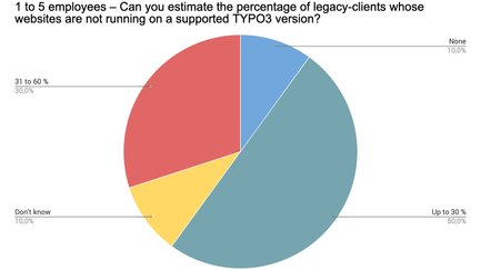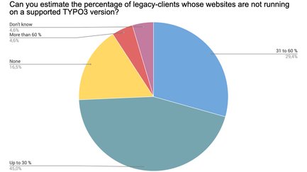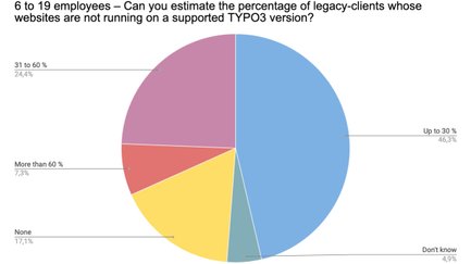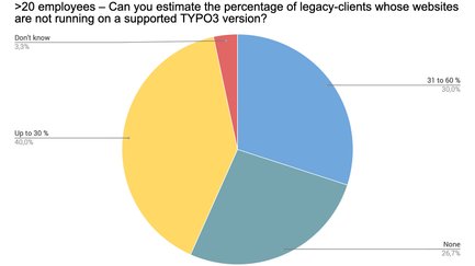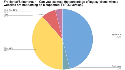 Es wird deutlich, dass von den meisten Alt-Kunden der Befragten nicht allzu viele Websites auf Basis alter TYPO3-Versionen laufen. 16,5 % der Teilnehmer gaben entsprechend sogar an, gar keine Kunden außerhalb des ELTS-Systems zu betreuen. Daraus lässt sich ableiten, dass die meisten Teilnehmer ihre Kunden-Projekte regelmäßig updaten – mit Luft nach oben. Wir werten dies als positives Zeichen von den teilnehmenden Mitgliedern an die Community.