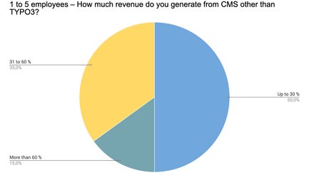 Wenn es um den geringsten nicht-TYPO3-generierten Umsatz geht, stehen Einzelunternehmer an der Spitze (23 % in Summe). Kleine Unternehmen mit bis zu 5 Mitarbeitern nutzen im Vergleich am meisten andere CMS (50 % in Summe).