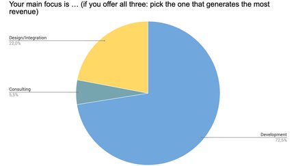 72,5 % aller Teilnehmer konzentrieren sich auf bzw. generieren den meisten Umsatz mit Entwicklung. Interessant ist dennoch, dass in Summe über ein Viertel der befragten TYPO3-Association-Mitglieder den meisten Umsatz nicht mit der Entwicklung, sondern mit Design/Integration (22 %) und Beratungsleistungen (5,5 %) generiert.