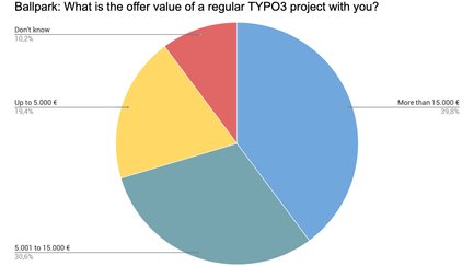 Von allen Teilnehmern, die den Wert eines TYPO3-Projektangebots angegeben haben, hat ein Großteil mehr als 15.000 € gewählt. Etwas unter ein Drittel gibt den Wert mit 5.000 bis 15.000 € an, kleinere Projekte von unter 5.000 € werden von 19,4 % der Teilnehmer angeboten.