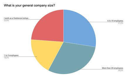 Zunächst einmal ging es darum, die Unternehmensgrößen der teilnehmenden Agenturen zu ermitteln. Die vier angebotenen Gruppen – Freelancer/Einzelunternehmer, 1 bis 5 Angestellte, 6 bis 19 Angestellte, mehr als 20 Angestellte – verteilen sich einigermaßen gleichmäßig. »Große« Agenturen nehmen jedoch den sichtbar größten Teil des Kuchens ein (30,3 %).