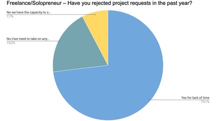 Freelancer haben mit Abstand die meisten Projekte aus Zeitmangel abgelehnt (73,1 %), während mittelgroße Agenturen (6-19) hier den geringsten Wert aufweisen (26,7 %). Ein Mangel an Entwicklern scheint mit der Unternehmensgröße zu korrelieren. In jedem Fall haben alle Gruppen zu weit mehr als 50 % im vergangenen Jahr Projektanfragen abgelehnt.