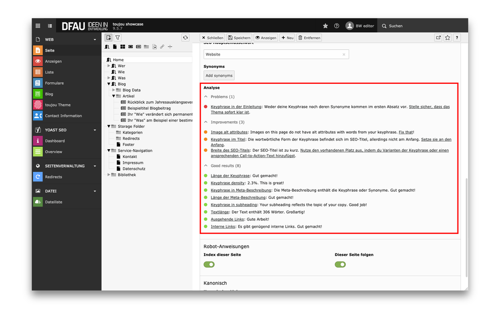 HTML-Code nach aktuellen Standards, einfache Anleitungen für »sprechende URLs« sowie saubere Umleitungen und Verlinkungen zählen zu den toujou-Standards. Und Yoast SEO, eines der am weitesten verbreiteten SEO-Werkzeuge.
